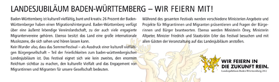 Dieses Jahr ist das Festival dazu noch Bestandteil der Feierlichkeiten zum Landesjubiläum Baden-Württemberg. Das Land will durch die Aufnahme des SommerFestivals in den Reigen der Jubiläumsveranstaltungen ein deutliches Zeichen setzen für eine kulturell vielfältige Bürgergesellschaft.