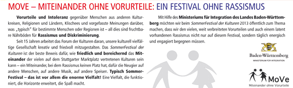 Das SommerFestival der Kulturen ist ein großes Bürgerfest und ein Ort der Begegnung mit begeisterten Menschen aller Nationalitäten, Hautfarben und Altersgruppen ein Fest für alle, das Stuttgart von seiner besten, seiner interkulturellen Seite zeigt.