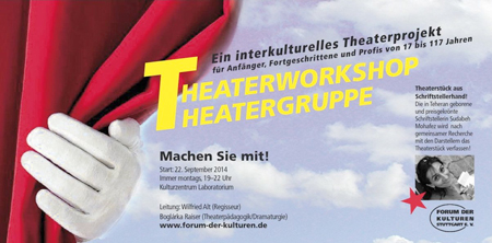 Wir laden alle Interessierten auf eine theatralische Spurensuche im Stuttgarter multikulturellen Alltag ein. Durch gemeinsame Recherche und Gespräche mit eingeladenen Gästen wollen wir Antworten auf unsere Fragen finden und aus diesen Antworten zusammen mit einem Schriftsteller ein spannendes Theaterstück formen und auf die Bühne bringen.