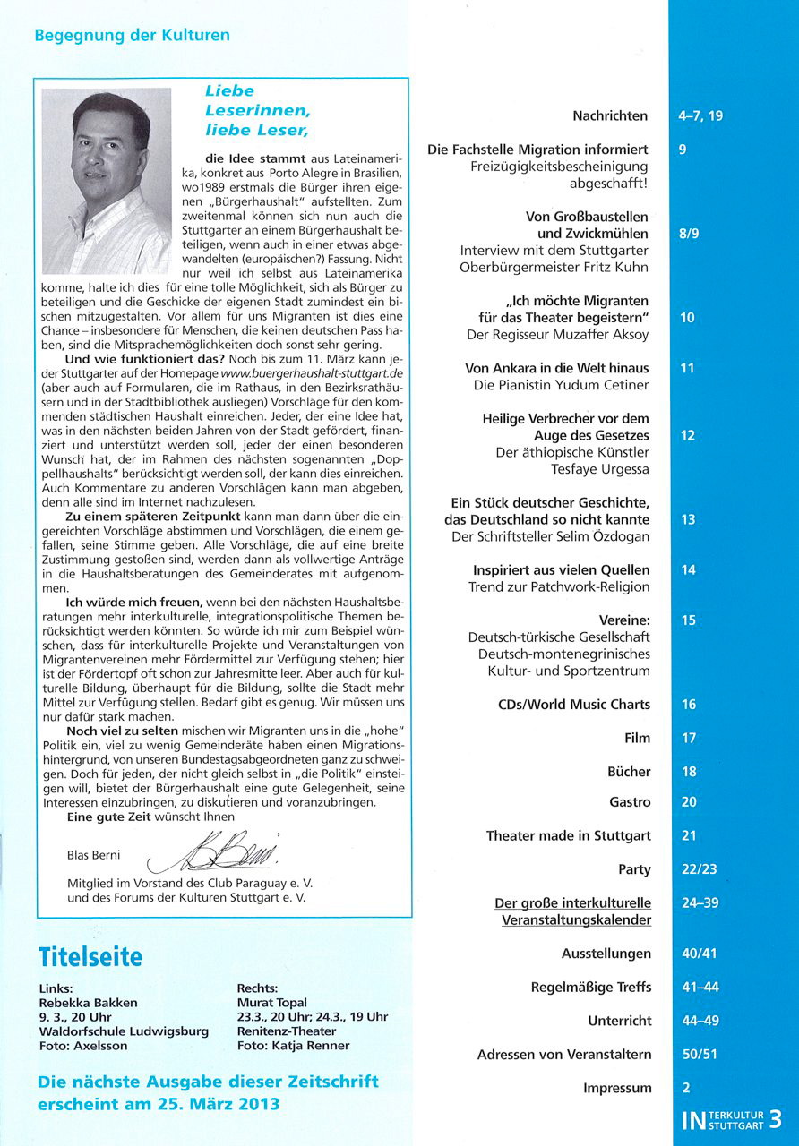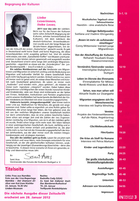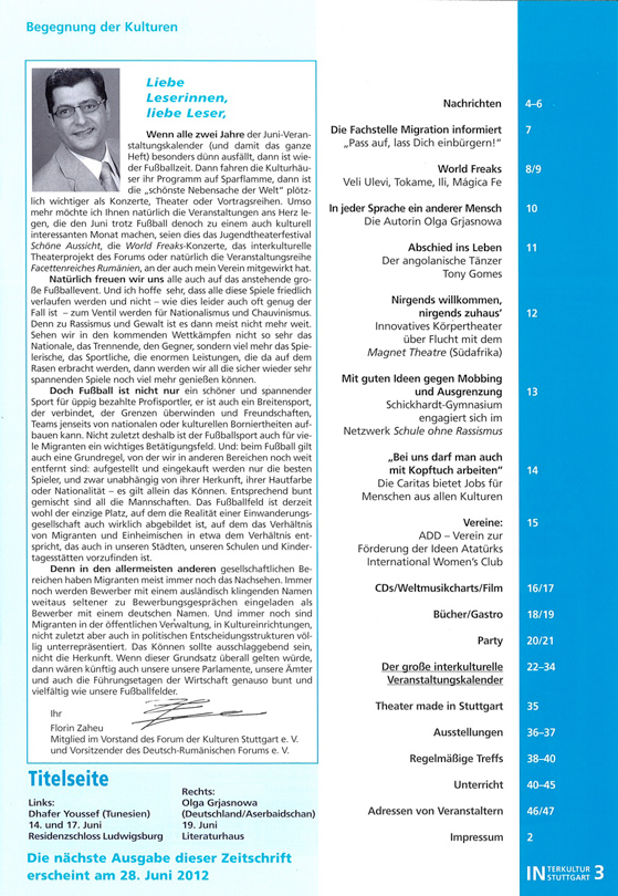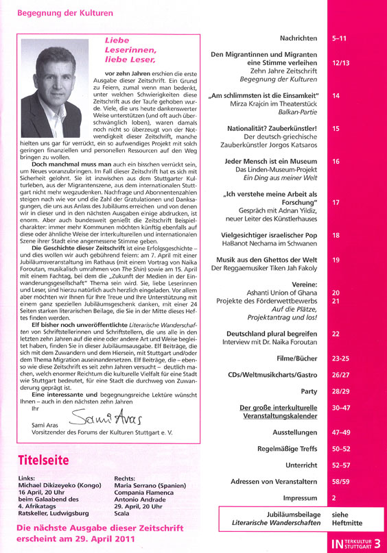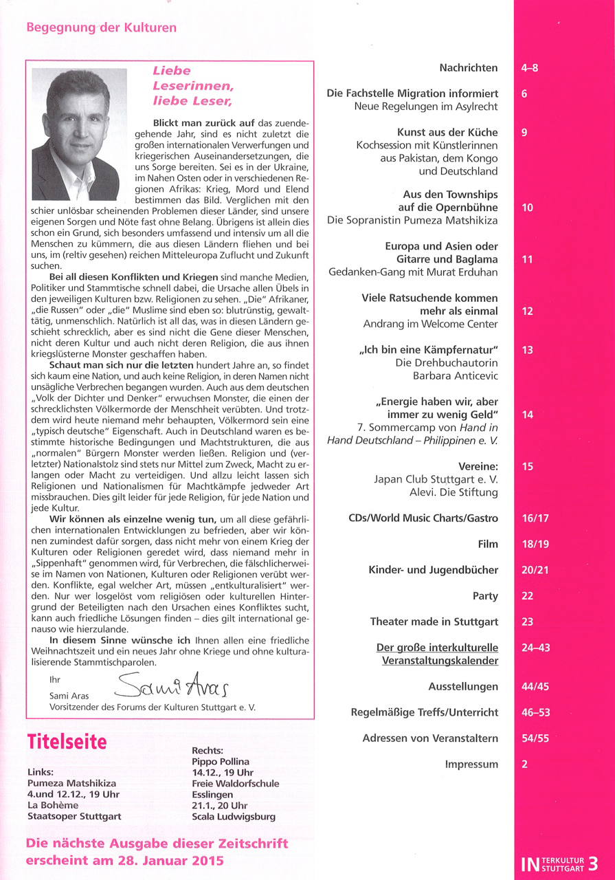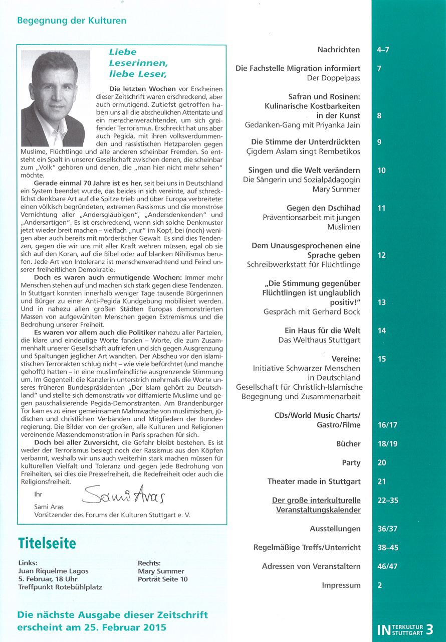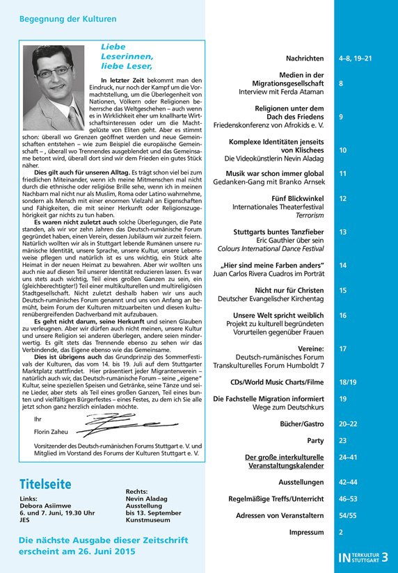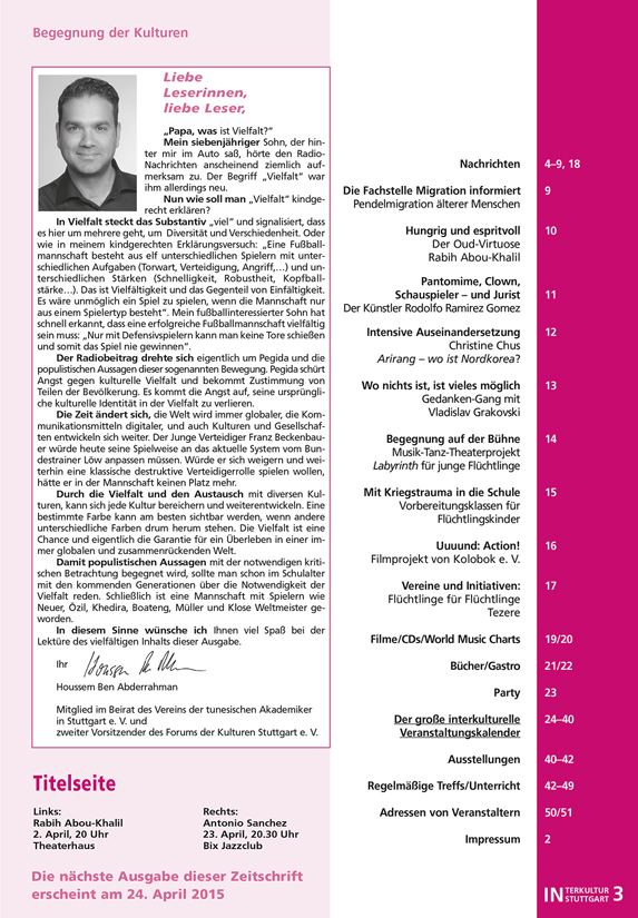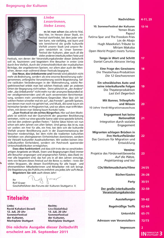 | Juni 2015 | Mai 2015 | April 2015 | März 2015 | Februar 2015 | Dezember 14 / Januar 15 | November 2014 | Oktober 2014 | Sommer 2014 | Juni 2014 | Mai 2014 | April 2014 | März 2014 | Februar 2014 | Dezember 13 / Januar 14 | November 2013 | Oktober 2013 | Sommer 2013 | Juni 2013 | Mai 2013 | April 2013 | März 2013 | Februar 2013 | Dezember 12 / Januar 13 | November 2012 | Oktober 2012 | Sommer 2012 | Juni 2012 | Mai 2012 | April 2012 | März 2012 | Februar 2012 | Dezember 11 Januar 12 | November 2011 | Oktober 2011 | Sommer 2011 | Juni 2011 | Mai 2011 | Sonderbeilage zur Jubiläumsausgabe | Jubiläumsausgabe April 2011 |
